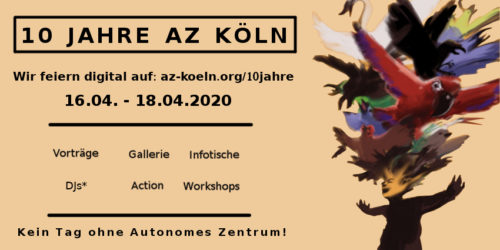 Am Donnerstag, den 16.04.20, jährt sich die Besetzung des AZ Köln zum 10ten mal. Leider gibt es gerade wenig zu feiern: die (medizinische) Lage für Flüchtende an den EU-Außengrenzen spitzt sich weiter zu, Grenzschließungen gepaart mit rigiden Demonstrationsverboten und deren unverhältnismäßige Umsetzung durch die Cops sind innerhalb kürzester Zeit Normalität, die sich abzeichnende Krise des Kapitalismus trifft jetzt schon die breite Masse. Kurz: die Ungleichheiten, Ausgrenzungen und Krisen, die der Kapitalismus produziert, verschärfen sich und wir sollen Hände waschend auf bessere Zeiten hoffen und bloß Zuhause bleiben – dann wird alles schon wieder.