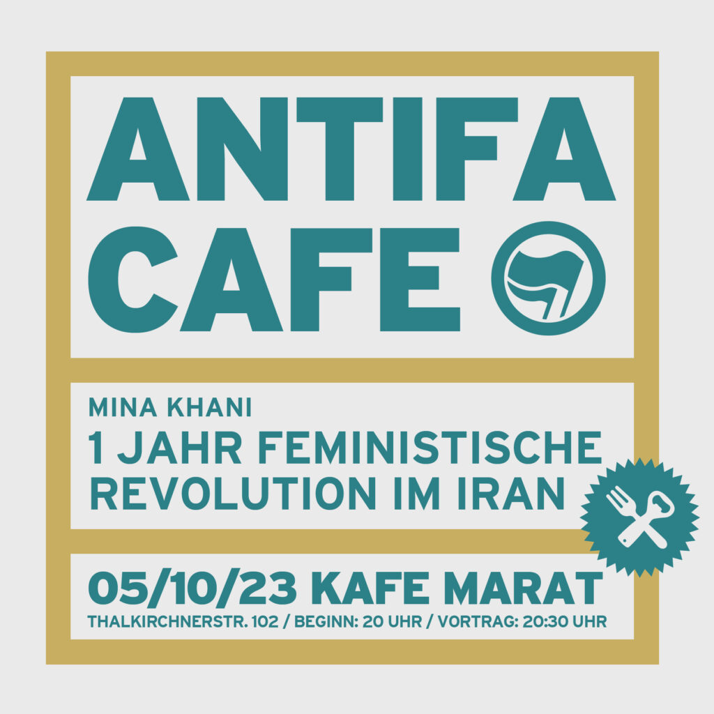 flyer September 25, 2023 1819 × 1819 Antifa-Café: 1 Jahr feministische Revolution im Iran (Mina Khani)