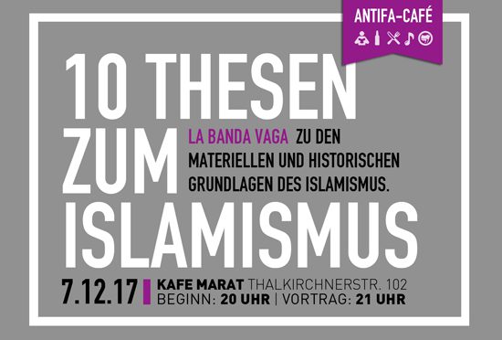 Der Islamismus ist ohne Frage eines der zentralen Themen der Gegenwart. Die journalistische und wissenschaftliche Flut an Interpretationen und Theorien ist kaum noch zu überschauen, lediglich brauchbare materialistische Analysen tauchen wenn überhaupt nur vereinzelt auf. Dies führt, auch unter Linken, nicht selten zu katastrophalen politischen Einschätzungen: Für die einen sind zumindest bestimmte islamistische Gruppierungen Ausdruck eines berechtigten antiimperialistischen Widerstandes, andere wiederum wollen dem Islamismus im Schulterschluss mit Staat und Militär mit „westlichen Werten“ entgegentreten. Beides ist unserer Ansicht nach verfehlt. Darum haben wir den Versuch unternommen, uns dem Phänomen mit einigen Thesen über die materiellen und historischen Grundlagen des Islamismus sowie zu den daraus resultierenden politischen Konsequenzen anzunähern. Diese Thesen, die im neuen Kosmoprolet #5 erscheinen, würden wir gerne mit euch diskutieren.