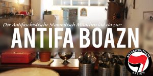 Einmal im Monat veranstalten wir unsere „Antifa Boazn“. Mit Vorträgen, Filmen, Diskussionen zu aktuellen antifaschistischen Themen. Das ganze in lockerer Atmosphäre mit leckerem veganem Essen und kühlen Getränken. Diesmal: