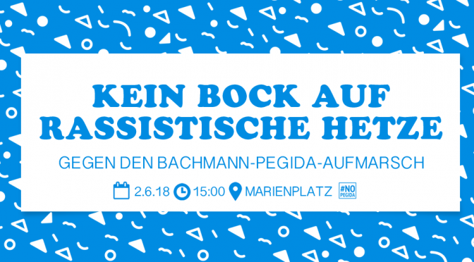 Kein Witz. Am 2. Juni will sich die Pegida-Dresden/München-Gang erneut in München zum Kasper machen. Als so called “Das Original“ wirbt der Kreis um Lutz Bachmann und Michael Stürzenberger erneut auf den Marienplatz. Von dort aus soll die allseits bekannte Route über das Tal, den Thomas-Wimmer-Ring, die Maximilianstraße, die Dienerstraße zurück zum Marienplatz führen. Ob “das Original“ mit seinen Aufmärschen in erster Linie darauf abzielt, dem Erzfeind – also Pegida München – eins auszuwischen oder ernsthaft hofft, hier einen Fuß auf den Boden zu kriegen, ist unklar. Klar ist nur: wir haben kein Bock auf rassistische Hetze, nationalistisches Gegeifer und reaktionäre Wüteriche.