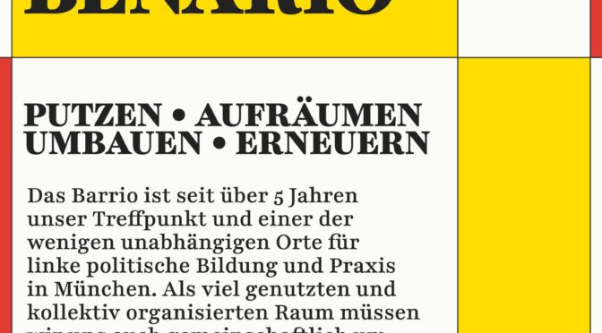 Das Barrio ist seit über 5 Jahren unser Treffpunkt und einer der wenigen unabhängigen Orte für linke politische Bildung und Praxis in München. Als viel genutzten und kollektiv organisierten Raum müssen wir uns auch gemeinschaftlich um seine Instandhaltung kümmern. Während sich die politischen Ereignisse überschlagen, gerät das schnell in Vergessenheit.