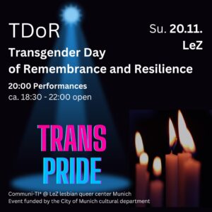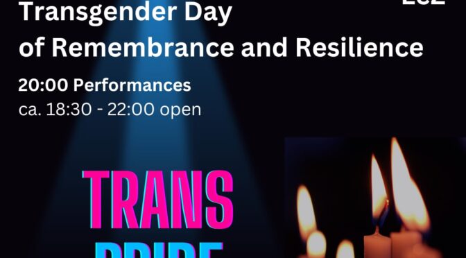 Am 20.11.2021 wollen wir im Lesbisch Queeren Zentrum am Abend zum Gedenken zusammenkommen und uns gemeinsam stärken. Wie wollen die positiven Seiten des trans* seins sichtbar machen. Mit Performances und Lesungen.