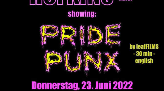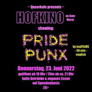 Los geht es mit kühlen Getränken und veganem Essen (wie gewohnt auf Spendenbasis) um 19:00 Uhr. Ab ca. 21 Uhr verwandeln wir den Hof in ein Kino und zeigen den Film Pride Punx – this is unity music.