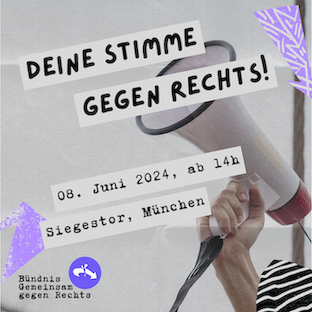 Unter dem Motto "Deine Stimme gegen Rechts!" ruft das Bündnis "Gemeinsam gegen Rechts" am 08.06.2024 um 14 Uhr zu einer Demonstration am Siegestor auf. Nach erfolgreichen Großdemonstrationen wie der "Demonstration am Siegestor" und dem "Lichtermeer" auf der Theresienwiese organisiert das Bündnis kurz vor der Europawahl eine weitere Kundgebung. Die Demonstration wird nach der Auftaktkundgebung vom Siegestor zum Königsplatz ziehen, um sich dort gegen 15.45 Uhr mit der von "EUre Wahl" organisierten Demo "Rechtsextremismus stoppen - Demokratie verteidigen" zu vereinen. Laut sein gegen Rechts! Das kürzlich veröffentlichte Sylter Video verdeutlicht eindringlich den Ernst der Lage: Eine Gruppe von Menschen grölt in ausgelassener Partystimmung rassistische Parolen. Rechte Parteien wie die AfD erreichen neue Höchstwerte, Angriffe auf politisch aktive Menschen eskalieren, und rassistisch motivierte Gewalttaten sowie die Diskriminierung queerer und behinderter Menschen nehmen weiter zu. Gleichzeitig werden rechtskonservative und rechtspopulistische Narrative und Standpunkte auch in der sogenannten politischen Mitte immer salonfähiger. Auch das gefährdet unsere Demokratie. Das Bündnis Gemeinsam gegen Rechts ruft auf: "Am 08.06. sagen wir laut STOP! Als Bündnis Gemeinsam gegen Rechts positionieren wir uns nicht nur gegen Rechtsextremismus, sondern gegen jede Form von rechter Politik. Geh mit uns auf die Straße, sei laut und bunt. Für eine offene, solidarische und vielfältige Gesellschaft." Das Datum der Demo ist bewusst gewählt. Am 09.06. findet die Wahl für das Europarlament statt. Die Organisator:innen finden: "Wählen ist ein guter Start. An diesem Tag ist es an uns. Deshalb - Kreuze machen. Ohne Haken. Aber auch nach der Wahl brauchen wir Stimmen. Ob Europa oder Deutschland: Demokratie muss im Alltag dauerhaft verhandelt werden. Das kann anstrengend sein – denn wir müssen uns mit anderen Positionen auseinandersetzen und gewaltfrei streiten! Aber es lohnt sich - denn gemeinsam sind wir immer stärker."