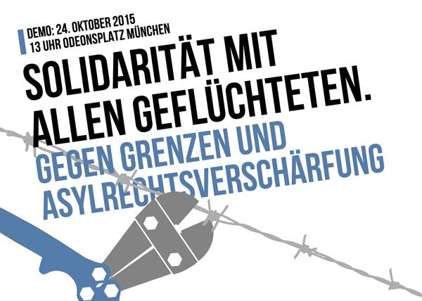 Diese Zustände sind unerträglich. Wir wollen die freie Wahl des Aufenthaltortes für alle Menschen, den Stopp der Dublin III Abschiebungen und bevormundender Quotenregelungen. Wir wollen eine solidarische Gesellschaft ohne rassistische Ausschlüsse. Eine solche kommt jedoch nicht von allein. Die Ereignisse der letzten Monate haben einer breiten Öffentlichkeit gezeigt, wie Geflüchtete kämpfen müssen, um Grenzen zu überwinden, und so auch gegen herrschende Interessen politische Verhältnisse verschieben. Wir solidarisieren uns mit allen Menschen auf der Flucht und ihren Kämpfen und tragen am 24. Oktober unseren Protest auf die Straße.