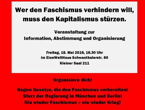 Bei dem bayerischen Polizeiaufgabengesetz handelt es sich um einen kleinen Baustein in einer ganzen Reihe von materiellen und politischen Maßnahmen, mit denen seit Jahren und gezielt der Notstand der Republik vorangetrieben wird. Vorbereitet werden Unterdrückung und Niederschlagung von Streiks und Aufständen. Zuerst richten sich die Repressionen gegen Migranten und Jugendliche, gemeint sind aber die Arbeiter und letztlich alle, die Widerstand gegen Ausbeutung und Krieg leisten. Wie wir den Kampf dagegen nützen können, die Kräfte für ein neues, besseres  Gesellschaftssystem zu sammeln, zeigt diese Veranstaltung.