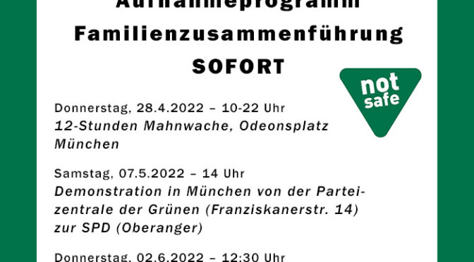 Die neugewählte Bundesregierung der Ampel-Parteien und auch die bayerische Regierung müssen umgehend dafür sorgen, dass es zu einem Kurswechsel in der deutschen Afghanistan-Politik kommt. Daher werden wir den Grünen sowie der SPD stellvertretend einen Besuch abstatten. Wir fordern: Bleiberecht – Aufnahmeprogramm – Familienzusammenführung!