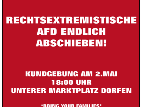 Der Kreisverband Erding der Die PARTEI veranstaltet am 2. Mai ab 18 Uhr eine Kundgebung am Unteren Marktplatz in Dorfen, zu der die Organisatoren alle Menschen in und um Dorfen herzlichst einladen. Das Motto der Veranstaltung lautet „Alternativlos Glücklich!!!“, womit sich Die PARTEI Kreisverband Erding ebenso wie die Mehrheit der deutschen Wahlberechtigten gegen die rechtsextremistische AfD positioniert. Die AfD veranstaltet am gleichen Tag nur ein paar Meter entfernt einen Vortrag mit dem Abgeordneten Hansjörg Müller als Gastredner. „Wir wollen die Überfremdung des Landkreises durch diese blaue Kameradschaft stoppen! Scheisse bleibt innen braun, auch wenn man sie aussen blau anmalt.“, erklärt der Vorsitzende des Kreisverbands Erding Die PARTEI, Oliver Pyttlik.