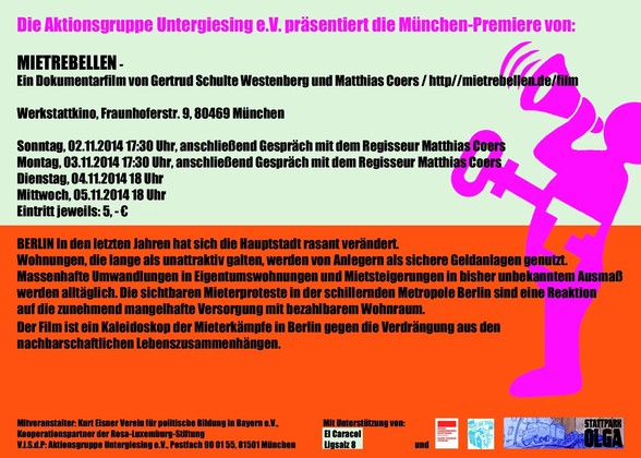 Im Rahmen unserer Filmreihe zur Gentrifizierung zeigt die Aktionsgruppe Untergiesing vom 2.-5. November im Werkstattkino den Film “Mietrebellen”.