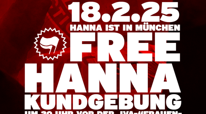 Ab dem 19.2. wird die Nürnberger Antifaschistin Hanna in München vor Gericht stehen. Ihr wird vorgeworfen, im Februar 2023 am Rande eines Naziaufmarsches in Budapest an körperlichen Auseinandersetzungen beteiligt gewesen zu sein. Lasst Antifas nicht mit der Repression allein!