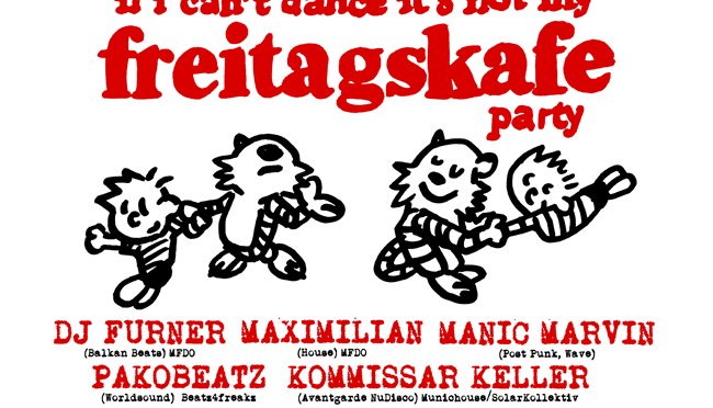 Das Freitagskafe schmeißt den Freitag im selbstverwalteten Kulturzentrum Kafe Marat. Euch erwarten hier gute Musik, günstige Getränke und leckeres veganes Essen. Dabei soll es nicht nur Raum für unkommerzielle Parties und Konzerte geben sondern auch antifaschistische, antisexistische und antirassistische Projekte und Aktionen unterstützt werden.