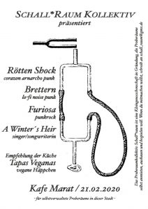 Das Freitagskafe schmeißt den Freitag im selbstverwalteten Kulturzentrum Kafe Marat. Euch erwarten hier gute Musik, günstige Getränke und leckeres veganes Essen. Dabei soll es nicht nur Raum für unkommerzielle Parties und Konzerte geben sondern auch antifaschistische, antisexistische und antirassistische Projekte und Aktionen unterstützt werden.