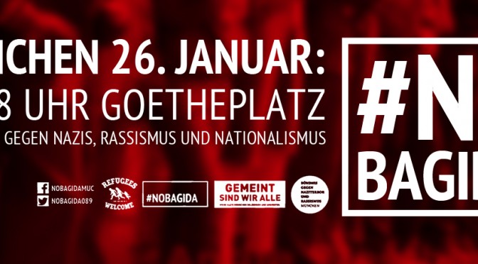 Für den 26.1. plant “Bagida” erneut einen Marsch in München. Auftakt ist 18.30 Uhr am Goetheplatz, von wo aus es über die Lindwurmstraße zum Sendlinger Tor Platz gehen soll. (Die Route kann sich noch kurzfristig ändern, wir werden euch über mögliche Änderungen informieren.)