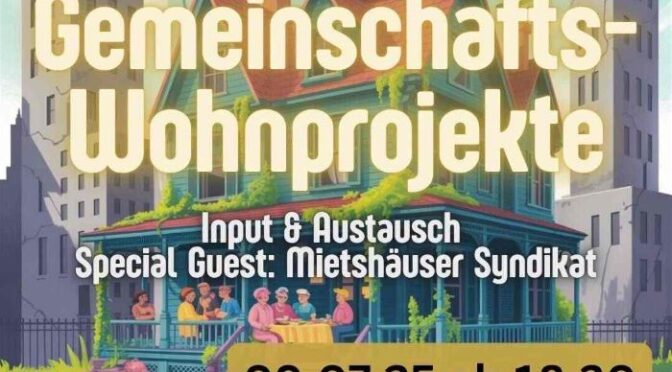 Wie können solidarische Wohnformen aussehen? Was braucht’s dazu? Was sind Strukturen im Mietshäusersyndikat? Eine Person aus dem Mietshäusersyndikat stellt uns Erfahrungen an einem konkreten Projekt vor. Kommt gerne, diskutiert mit uns und lasst uns gegenseitig anregen – für mehr Zusammenhalt und Gemeinschaft beim Wohnen! 🏘️ Wann & Wo? 📍 Ort: Badgasteinerstraße 5, Nachbarschaftstreff Feierwerk, Ubahn: Partnachplatz ⏰ Zeit: Mi. 09.07. – Beginn: 18:30 (ca. 2h) + Plus Special Überraschung – selbst-gebaute Klimaanlage zum Testen 😀