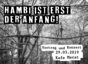 Vortrag von und mit Aktivist*innen aus der Besetzung im Hambacher Wald, Live-Musik der Augsburger Akustik-Punkrockband Wollstiefel und der Münchner Punkband Wunst sowie Tanzen bis die Beine schwer werden mit einem melodischen Mix von DJ Vero Fuchs aus dem Netzwerk. Am Tresen massenweise Rote-Hilfe-Beitritte und vegane Zaubereien aus der Ende-Gelände-Anarcho-Küche.