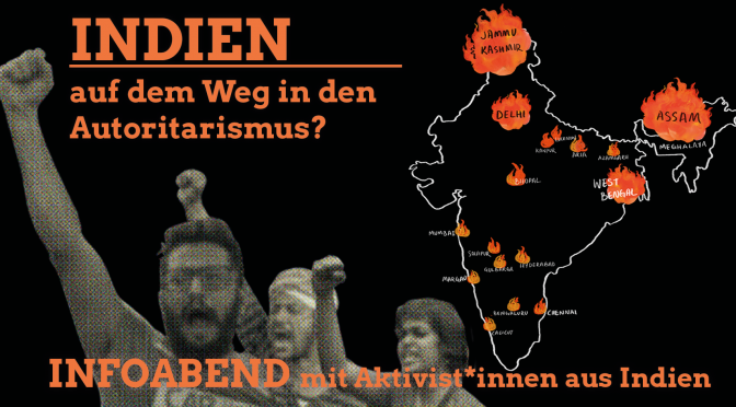 Seit Dezember 2019 finden in Indien Massenproteste gegen ein neues Einbürgerungsrecht („The Citizenship Amendment Act“ oder CAA) und gegen ein Bevölkerungsregister „National Register for Citizens“ (NRC). An vorderster Front der Proteste stehen Studierenden, “Säkularisten”, Frauen und vor allem die zweihundert Millionen Muslime – die durch das Vorhaben mit am härtesten getroffen werden. Die Gesetze sind aber nicht nur antimuslimisch, sie wenden sich gegen Frauenrechte, gegen Arme, gegen Dalit (die Menschen, die zu den „untersten Kasten“ gezählt werden) und gegen Transgender Personen. Sie sind ein Angriff auf die Grundrechte, die in der indischen Verfassung festgeschrieben sind.