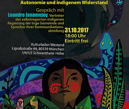 Wir führen zuerst den Film „Quintin Lame, Raíz de Pueblos“ vor und danach haben wir eine Diskussion mit Leandro Janamejoy, Vertreter der selbstregierten indigenen Regierung der Inga Gemeinde in Aponte, Nariño.