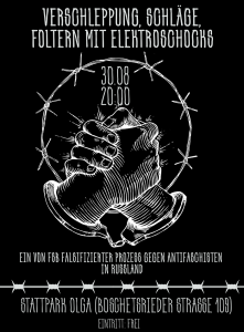 When there is solidarity – there is no way to hide repressions behind the curtain of borders and corrupted media and to hide tortures behind the walls of prisonsand police cars. And the week of solidarity with locked up anarchists is a good reason to remember how that works. On the 30th of August at 8 o`clock in the evening we will discuss the repressions against anarchist and antifascists in Russia and particularly the case of so called „Network“.