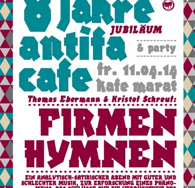 Das Antifa-Café im Kafe Marat wird 8 Jahre alt und das muss natürlich gebührend gefeiert werden. Am Freitag, den 11. April bescheren uns aus diesem Anlass Thomas Ebermann und Kristof Schreuf einen analytisch-satirischen Abend mit guter und schlechter Musik, zur Erforschung eines Phänomens, das Schlüsse auf die Verrücktheit des kapitalistischen Ganzen erlaubt: