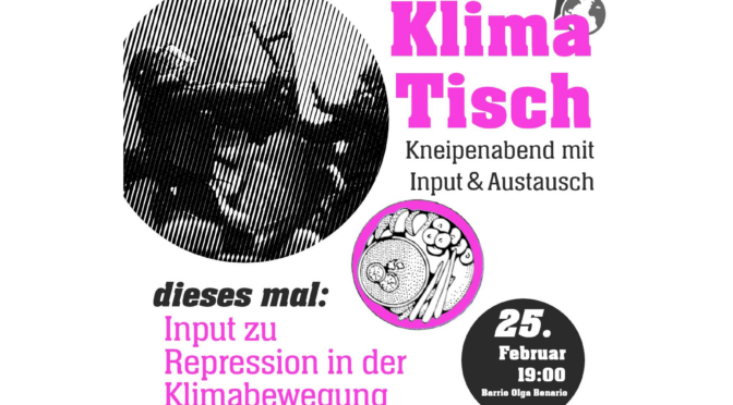 Die Klimabewegung ist immer häufiger von Repression betroffen. Laut Duden bezeichnet Repression die „[gewaltsame] Unterdrückung von Kritik, Widerstand, politischen Bewegungen, individueller Entfaltung, individuellen Bedürfnissen“. Wir wollen sie uns beim kommenden Klimatisch zum Thema machen uns uns fragen: Wie funktioniert Repression und welche Rolle hat der Staat dabei? Was gibt es international schon an Repression gegen Klimaaktivist:innen? Wie gehen wir damit um?
