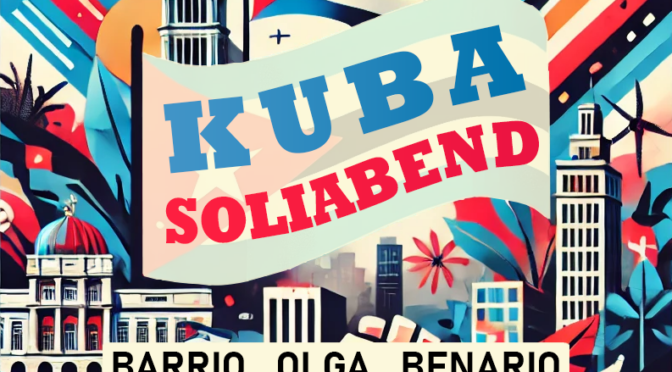 Das wollen wir nicht einfach so hinnehmen. Um Kuba zu unterstützen, veranstaltet das Antikapitalistische Klimatreffen München einen Soliabend: Wir zeigen unsere aktivistische Doku “Klimaschutz – Von Kuba lernen”, diskutieren über die aktuelle Lage in Kuba und Möglichkeiten, das kleine Land zu unterstützen, und lassen den Abend bei kubanischem Essen, Cocktails und Live-Musik ausklingen. Kommt vorbei!
