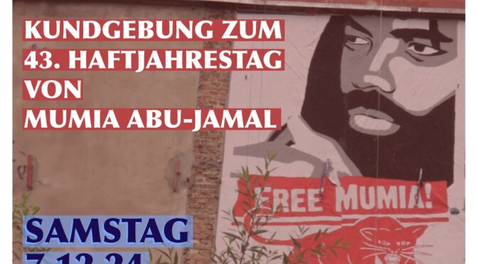 Am Montag, den 9. Dezember 2024, ist der 43. (!) Haftjahrestag des politischen Gefangenen Mumia Abu-Jamal. Er ist mittlerweile 70 Jahre alt, bis jetzt musste er einen Großteil seines Lebens in Haft verbringen.