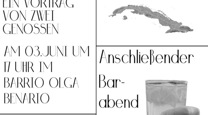 Kuba ist eines der wenigen Ländern, deren Wirtschaft nicht kapitalistisch organisiert ist. Außerdem wurde Kuba 2006 vom WWF zum ersten nachhaltigen Land der Welt erklärt. Immer wieder schauen wir deshalb auf das kubanische System, um zu lernen und zu zeigen, wie eine Alternative jenseits unserer kapitalistischen Realität aussehen kann. Am Samstag, dem 03. Juni wird ein Genosse, der einige Zeit in Kuba gelebt hat, bei uns im Barrio Olga Benario in einem spannenden Vortrag über seine Erfahrungen berichten und einen weiteren Genossen live aus Kuba zuschalten. Wenn ihr aus erster Hand erfahren wollt, wie das Leben in Kuba ist, kommt vorbei!