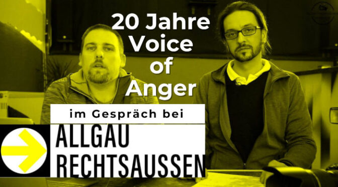 Grund genug also, sich in unserer nächsten Sendung über den rechten Untergrund im Allgäu um die Skinheadkameradschaft Voice of Anger zu unterhalten. Wie gefährlich ist er wirklich und welche Bedeutung hat er für die regionale, nationale und internationale Neonaziszene? Wird Voice of Anger das Jubiläum wie vor fünf Jahren mit einem großen Konzert feiern und so wieder hunderte Neonazis in die Region holen? Und dürfen wir uns auf weitere 20 Jahre organisierter Neonaziaktivitäten im Allgäu einstellen oder ist ein Ende in Sicht? Diese und weitere Fragen klären wir am Mittwoch, dem 20. April 2022 ab 20 Uhr im Livestream bei Allgäu rechtsaußen.