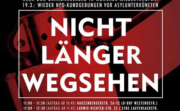 Am 27. Februar hetzte die Münchner NPD auf drei Kundgebungen gegen Unterkünfte für Asylsuchende in Milbertshofen. Lediglich eine knappe Woche später, schritten drei Jugendliche zur Tat und schleuderten Molotowcocktails auf die geplante Einrichtung in der Neuherbergstraße. An diesen Erfolg ihrer politischen Überzeugungsarbeit möchte die Nazi-Partei am Samstag anknüpfen. Diesmal plant sie die Stimmung in Laim anzuheizen. Machen wir den Rechten einen Strich durch die Rechnung!