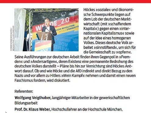 Seine Ausführungen zur deutschen Arbeit finden ihren Gegenpol in »Fremden « und »Andersartigen«, deren Existenz eine permanente Bedrohung des deutschen Volkes darstellt – Pläne bis hin zur Vernichtung sind Höckes Antwort darauf. Ob und wie Höcke und die AfD indirekt und direkt Bezug zu den Nazis und vor allem zu Hitlers »Mein Kampf« nehmen und damit einen neuen
