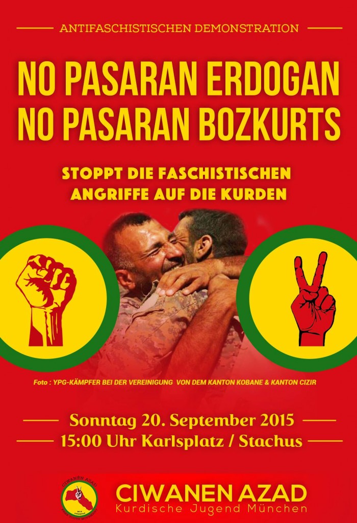 Hintergrund ist, dass der “Turkos MC”, der maßgeblich aus Unterstützern der “Grauen Wölfe” – also FaschistInnen – besteht, eine Demonstration vom Goetheplatz zum Odeonsplatz durchführen will. In den letzten Tagen und Wochen kam es in der Türkei, aber auch Europa zu unzähligen Angriffen auf kurdische Einrichtungen und Personen.
