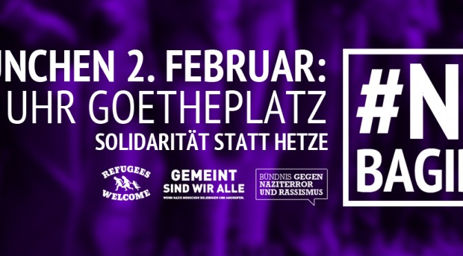 Seit einigen Monaten formiert sich in Deutschland eine Bewegung, die vorgeblich nur ihre Sorgen über eine angebliche „Islamisierung des Abendlandes“ ausdrücken möchte, tatsächlich aber offensiv gegen Flüchtlinge, Migrant_innen und muslimische Menschen hetzt. Ausgehend von Dresden, wo unter dem Kürzel „Pegida“ mittlerweile wöchentlich mehr als 15.000 Menschen ihren Rassismus und Nationalismus propagieren, haben sich Ableger in diversen anderen Städten gegründet. Unter dem Namen „Bagida“ fand eine solche Aktion am 12.1. erstmals auch in München statt. Die Liste der Anwesenden liest sich wie das Who-is-Who der bayerischen extremen Rechten: darunter Mitglieder des mittlerweile verbotenen Freien Netz Süd, der NPD, vieler rechtspopulistischer Gruppierungen, der AFD, sowie mit André Eminger auch ein Angeklagter im NSU-Prozess und mutmaßlicher Unterstützer jener Terrorgruppierung! Damit war die erste Bagida-Aktion defacto der größte Naziaufmarsch in München seit dem Marsch gegen die Wehrmachtsausstellung vor mehr als 10 Jahren. Auch am 19. und am 26. Januar gab es eine massive Beteiligung bayerischer Nenazis. Am 2. Februar wollen extrem Rechte ihre rassistische Hetze erneut auf die Straße tragen.
