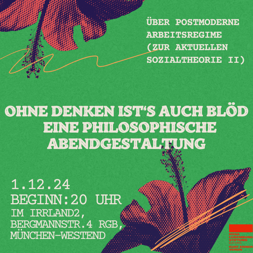 Ohne denken ists auch blöd. Postmorderne Arbeitsregime Oktober 9, 2024 1080 × 1080 Ohne Denken ist‘s auch blöd – eine philosophische Abendgestaltung Über postmoderne Arbeitsregime (Zur aktuellen Sozialtheorie II)