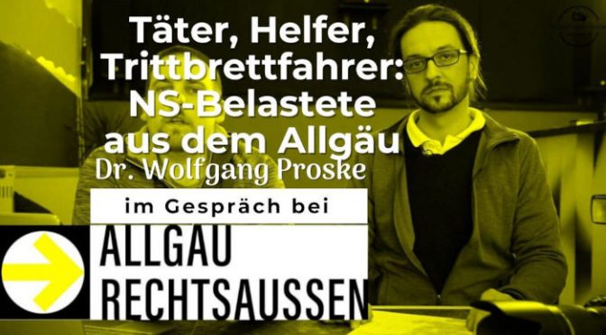 Was motiviert die historische Forschung, noch 75 Jahre nach dem Ende des Nationalsozialismus so genau hinzusehen? Müsste es nicht langsam gut sein, sollte man nicht die Geschichte ruhen lassen? Darüber spricht Allgäu rechtsaußen am Mittwoch, dem 15. Dezember 2021 ab 20 Uhr im Livestream mit Herausgeber Dr. Wolfgang Proske, dem immer wieder vorgeworfen wird, das Andenken Verstorbener in den Schmutz zu ziehen und Hinterbliebene aufzuwühlen.