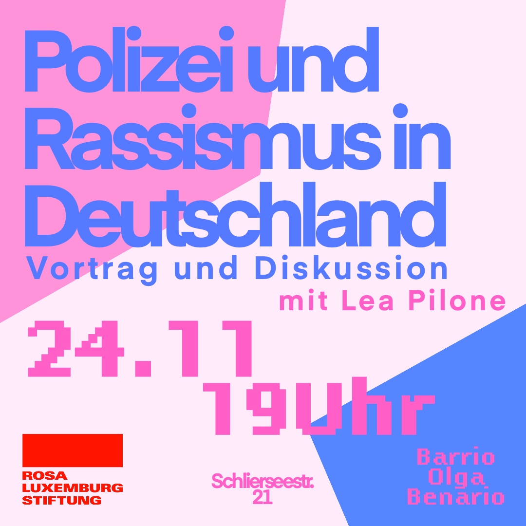 Warum gibt es die Polizei? Was hat das mit Kapitalismus zu tun? Und warum sind Polizisten so oft rassistisch? Und kann es überhaupt eine Polizei ohne Rassismus geben? Antworten auf diese Fragen wollen wir am 24.11. um 19 Uhr im Barrio Olga Benario mit Lea Pilone in ihrem Vortrag erarbeiten. Lea Pilone studiert Rechtswissenschaften an der FU Berlin und befasst sich mit dem Verhältnis von Kriminologie und Rassismus. Außerdem hat sie einen Aufsatz dazu im Sammelband „Die Diversität der Ausbeutung“ von Bafta Sarbo und Eleonaroa Roldán Mendívil veröffentlicht. Anschließend wollen wir gemeinsam diskutieren, es gibt Essen und Getränke auf Spendenbasis.