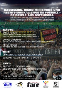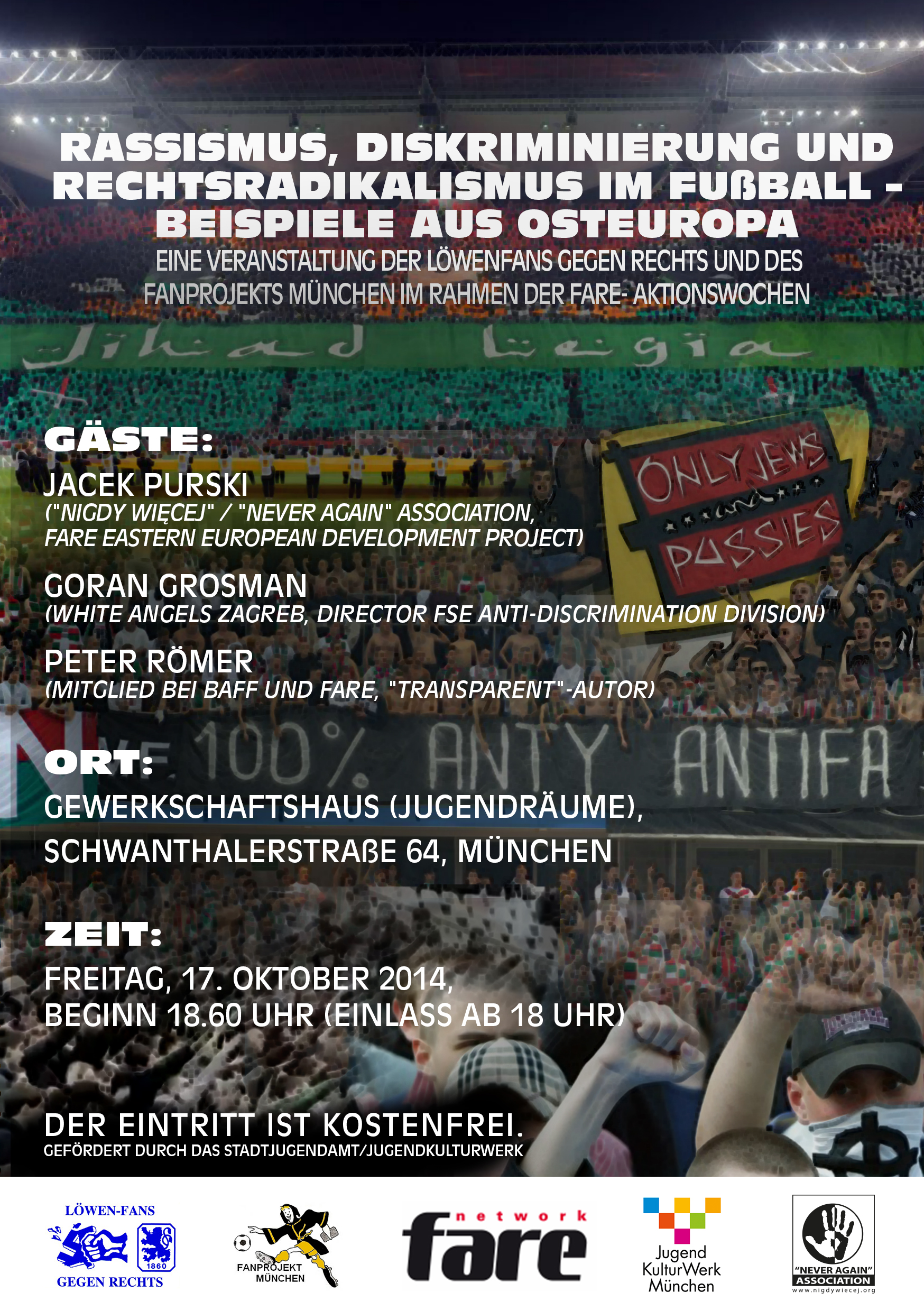 Die Löwenfans gegen Rechts und das Fanprojekt München laden herzlich zu einer Veranstaltung zum Thema “Rassismus, Diskriminierung und Rechtsradikalismus im Fußball – Beispiele aus Osteuropa” am 17. Oktober um 18.60 Uhr im Gewerkschaftshaus ein. Die Veranstaltung findet statt im Rahmen der FARE-Aktionswochen.