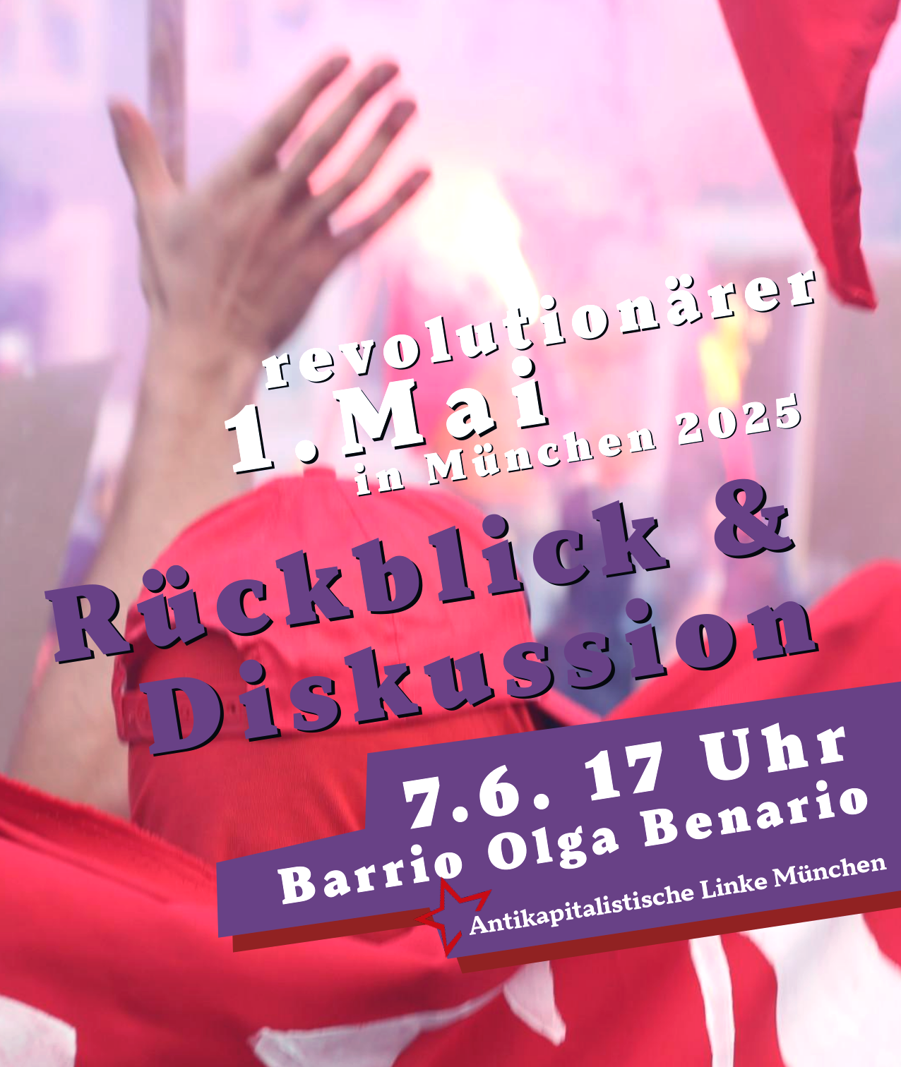 Der revolutionäre 1. Mai in München dieses Jahr: eine starke antimilitaristische Beteiligung an der DGB-Demo, die bis jetzt größte revolutionäre 1. Mai Demo und im Anschluss ein vielfältiges 1.-Mai-Fest. Dazu jede Menge spannende neue Ansätze im Vorfeld und am Tag selbst. Kommt vorbei und blickt mit uns darauf, was alles gelaufen ist, und diskutiert unsere politische Einordnung. Außerdem gibt es die heiß erwarteten  Ergebnissen der diesjährigen Befragung. Kommt vorbei und bringt euer Feedback mit!