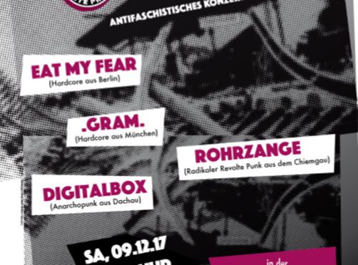 Am Samstag, 09.12.17 kommt die Berliner Hardcoreband EAT MY FEAR in die Rosenheimer Vetternwirtschaft. Gemeinsam mit .GRAM. (Hardcore aus München), ROHRZANGE (Punk aus dem Chiemgau) und DIGITALBOX (Punk aus Dachau) treten sie auf dem jährlich stattfinden „good night – white pride“ Konzert auf. Mit diesem Konzert wollen Bands und Veranstalter klar Position zu beziehen: „Rassismus und Faschismus sollen keinen Millimeter Platz eingeräumt werden“, auch nicht in der Musikszene.