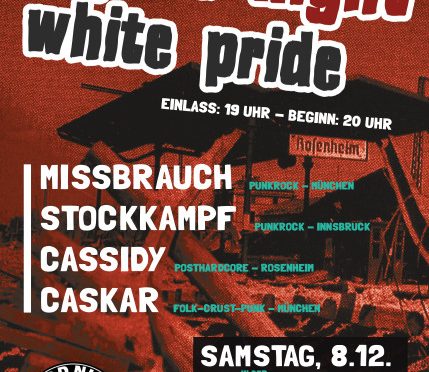 Am Samstag 08.12.2018 findet in der Rosenheimer Vetternwirtschaft das diesjährige „good night – white pride“ Konzert statt. Mit „Missbrauch“ (München), „Stockkampf“ (Innsbruck), „Cassidy“ (Rosenheim) und „Caskar“ (München) treten vier Bands aus der Punk/Hardcorszene auf, um musikalisch ein klares Zeichen gegen Rechts zu setzen.