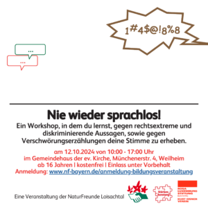Ein Workshop, in dem du lernst, gegen rechtsextreme und diskriminierende Aussagen, sowie gegen Verschwörungserzählungen deine Stimme zu erheben. Du kennst das sicher: In der Diskussion mit Arbeitskolleg*innen, dem Gespräch mit der Tante oder beim Grillen mit dem Sportverein fallen Sprüche, die uns die Sprache verschlagen. Später ärgern wir uns. Hätten wir doch den Mund aufgemacht, widersprochen, die rechten oder diskriminierenden Aussagen nicht einfach so stehen lassen. Aber bloß wie?