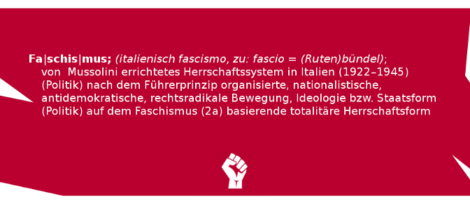 Ist die AfD faschistisch? Pegida? Erdogan? Was ist eigentlich Faschismus? Und gibt es den heute immer noch? Faschismus ist nicht irgendeine Herrschaftform, sondern die, die wohl die schlimmsten Verbrechen der Menscheitsgeschichte hervorgebracht hat. Deshalb gibt es wohl auch so viele Erklärungsansätze dafür, was Faschismus ist und wo er herkommt. Unser Referent möchte einen Überblick darüber geben, welche Erklärungsmodelle es gibt, welche wir gleich in die Tonne treten können und welche uns dabei helfen können, Faschismus zu verstehen und zu bekämpfen. Im Anschluss organisieren die GenossInnen der LARA aus Ingolstadt eine Soliparty. Strömt zuhauf!