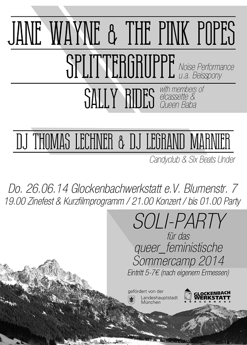Juni 10, 2014 501 × 700 Soli-Party für das queer_feministische Sommercamp // mit Jane Wayne & the Pink Popes // Splittergruppe // Sally Rides