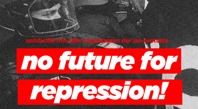Aktuell läuft eine Welle von Prozessen gegen Leute an, die im Zuge der IAA-Proteste Anzeigen erhalten haben. Am 26. April stehen drei Personen wegen „Verstoß gegen das Vereinsgesetz“ vor Gericht, denen vorgeworfen wird, auf dem IAA-Protestcamp Plakate aufgehängt zu haben, die sich mit dem kurdischen Befreiungskampf solidarisieren. Am 5. Mai sitzen mehrere Leute auf der Anklagebank, denen aufgrund der Hausbesetzung in der Karlstraße Hausfriedensbruch vorgeworfen wird. Am 2. Mai findet außerdem eine Gerichtsverhandlung gegen einen Genossen statt, dem versuchte Körperverletzung, Widerstand und „tätlicher Angriff auf Vollstreckungsbeamte“ vorgeworfen werden. Diese Paragrafen halten allzu oft dazu her, Eskalationen seitens Polizei auf Demos nachträglich zu rechtfertigen. Polizei und Staatsanwaltschaft versuchen im Nachgang der IAA zwanghaft, das Bild einer Bedrohung durch einen gewalttätigen Protest aufrecht zu erhalten. Sie brauchen entsprechende Verurteilungen, weshalb unserem Genossen nun der Knast droht. Als Klimagerechtigkeitsbewegung und als Linke müssen wir jetzt Zusammenhalten. Unser Widerstand gegen ein System, das unsere ökologischen Lebensgrundlagen immer weiter vernichtet und gegen eine Autoindustrie, die uns zielsicher in die Klimakatastrophe führt, ist legitim und notwendig! Stehen wir Seite an Seite mit unseren Freund*innen in den Prozessen die aktuell laufen und denen, die möglicherweise noch kommen! Vergessen wir auch nicht all die anderen, die aufgrund ihres Kampfes für eine bessere Welt von diesem Staat kriminalisiert und eingesperrt werden: Wir fordern Freiheit für Ella, Jan, Lina, Chris, Jo, Dy und alle anderen! Am Freitag, den 22. April, findet eine Demonstration in Solidarität mit den Betroffenen statt. Kommt mit uns auf die Straße!