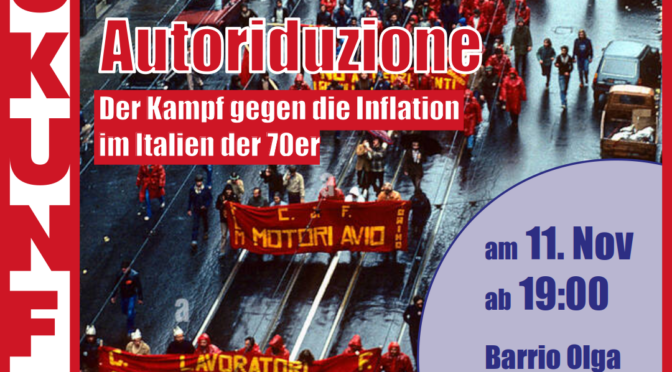 Diesmal geht es um DAS Thema der Stunde: Die Preissteigerungen. Wir wollen historisch herangehen und haben einen kurzen Input zu den Kämpfen gegen die Inflation im Italien der 70er Jahre für euch. Welche Instrumente haben die kämpfenden Arbeiter:innen genutzt, um die Krise zu dämpfen? Und wie haben sie gekämpft? Anschließend wollen wir mit euch noch bei einem gemütlichen Bierchen und etwas Essen darüber diskutieren, was wir aus diesen Erfahrungen für die aktuelle Situation verwenden können.