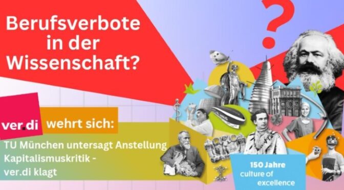 Die TU München geht sogar soweit, Menschen, die Kritik an der bestehenden Gesellschaft äußern, als Verfassungsfeinde abzustempeln. Und spricht so Berufsverbote aus! Dagegen klagt nun ein ver.di-Mitglied mit gewerkschaftlichem Rechtsschutz vor dem Münchner Arbeitsgericht.