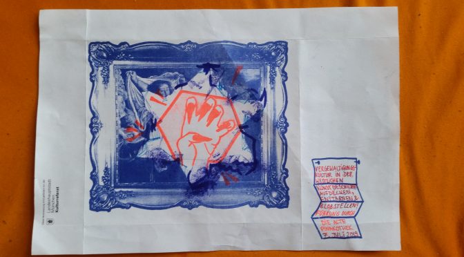 How did the flyer design come about? We made the flyer, which should look like a claw torn up an old painting – symbolic for the destruction of the paintings full of aestheticized rapes. In the design, the resulting hole was a pentagon, and in the realization it was a hexagon. The protruding paper shreds became a hexagram on the risograph printer… and this in blue, too, which can evoke associations with the Star of David. Not only in the interplay with the claw-like hand, which is supposed to illustrate a common motif in anti-Semitic depictions and the supposed „Jewish greed“, is this illustration in the afterhingness to be regarded as highly problematic. Due to time pressure, only two people saw the flyer before it was reproduced, and they paid particular attention to typos in the text. When the finished flyer was then shown in our network, some noticed the strong similarity to the Star of David. It was discussed in our group then under time pressure whether the flyer must be pulled completely from the circulation or how the graphic association can be dealt with. Now the flyer could not be changed quickly with an image editing program, because it had been created with a risograph. We decided no to throw  the flyers away and instead reworked all the flyers for hours with watercolor or edding to enhance the look of shredded paper and blur the contours of the star.
