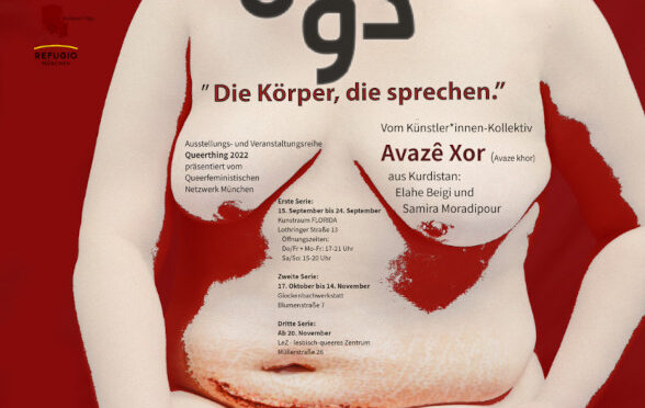 Poster zur Ausstellung "Die Körper, die sprechen."Erste öffentliche Ausstellung von bisher klandestiner Foto-Kunst vom Künstler*innen-Kollektiv Avazê Xor (Avaze Khor) aus Kurdistan. Für die Freiheitsrechte von Frauen und Queer-Communities, im Widerstand gegen patriarchale Gewalt.