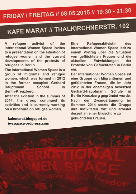 wspace_B_small Mai 3, 2015 437 × 620 Vortrag: Kämpfe von geflüchteten Frauen des International Women Space
