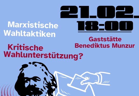 Kommt am Freitag (21.02.), um 18:00 Uhr, zu unserer Veranstaltung zu Marxistischer Wahltaktik und kritischer Wahlunterstützung der LINKEn, in der Gaststätte Benediktus Munzur, um mehr zu erfahren und mit uns zu diskutieren.